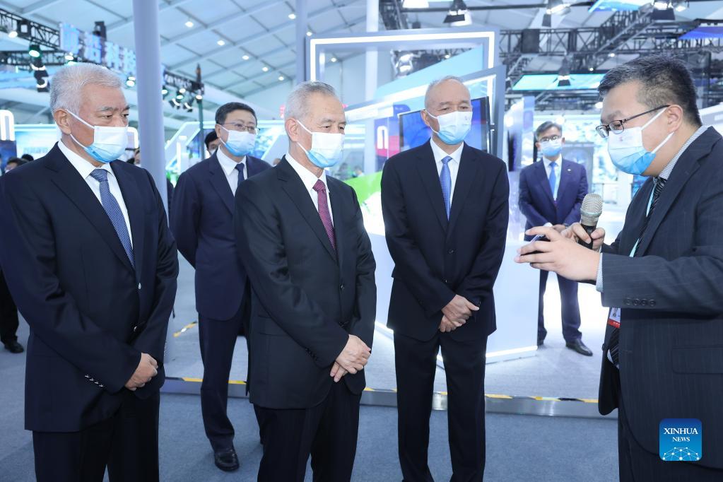 Chinese Vice Premier Liu He, also a member of the Political Bureau of the Communist Party of China (CPC) Central Committee, and Cai Qi, a member of the Political Bureau of the CPC Central Committee and secretary of the Beijing Municipal Committee of the CPC, inspect the China Beijing International High-tech Expo, before the opening ceremony of the 2021 Zhongguancun Forum (ZGC Forum) in Beijing, capital of China, Sept. 24, 2021. Cai presided over the opening ceremony of the ZGC Forum on Friday. (Xinhua/Liu Bin)