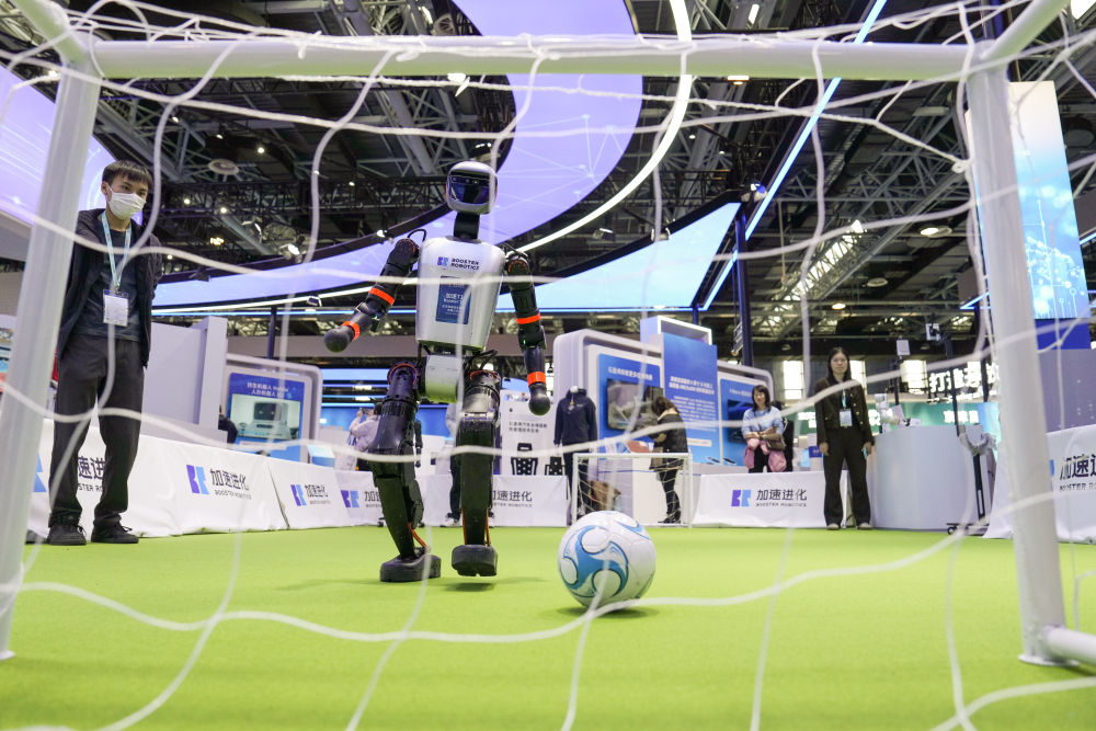 北京清飛科技有限公司的“妮婭”仿生人形機器人通過情緒識別算法與觀眾對話;北京加速進化科技有限公司(以下簡稱“加速進化”)的“加速 T1”不僅是開幕式舞蹈演員,還是常設(shè)展足球賽運動員;樂聚通研(北京)機器人技術(shù)有限公司(以下簡稱“樂聚通研”)的人形機器人“夸父”承擔(dān)著迎賓工作,為公眾解答疑問、提供講解和指引服務(wù)等。