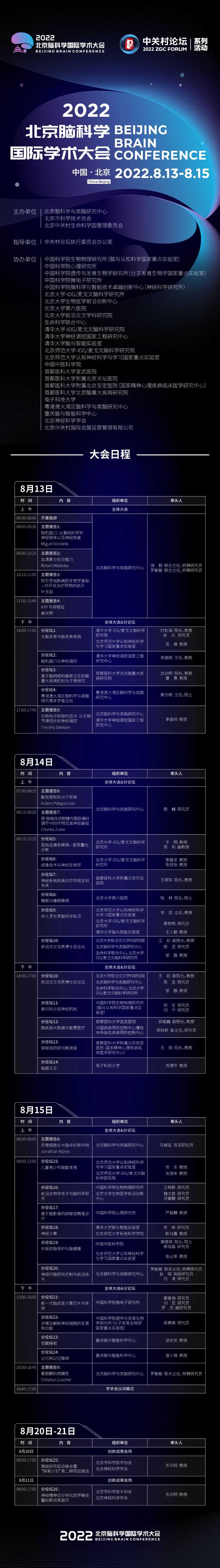 2022?北京腦科學(xué)國際學(xué)術(shù)大會正是秉承“好奇心推動的科學(xué)家認(rèn)真從事的研究是好的科學(xué)研究”,邀請了杜克大學(xué)名譽(yù)教授Miguel Nicolelis、斯坦福大學(xué)教授Robert Malenka、香港科技大學(xué)校長葉玉如院士、粵港澳大灣區(qū)腦科學(xué)與類腦研究中心主任高天明院士、牛津大學(xué)教授Tim Denison、Scripps研究所教授Ardem Patapoutian、哥倫比亞大學(xué)教授Charles Zucker、圣路易斯華盛頓大學(xué)醫(yī)學(xué)院教授Jonathan Kipnis、日內(nèi)瓦大學(xué)教授Christian Lüscher等來自美國、歐洲知名高校和研究所的43位外籍嘉賓及國內(nèi)外頂尖專家及優(yōu)秀的青年科學(xué)家共計150余位作線上報告。