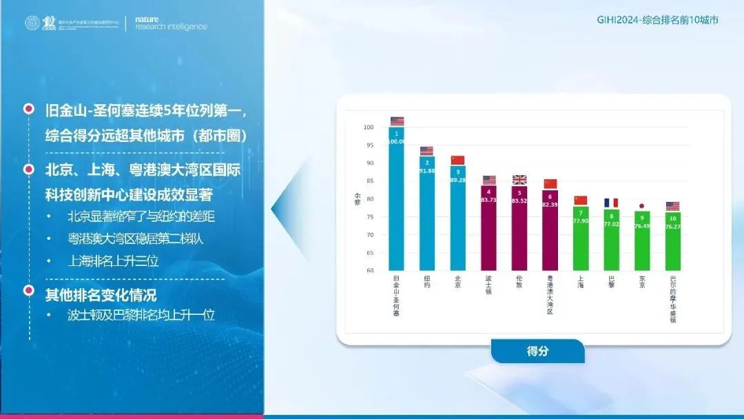 《國際科技創(chuàng)新中心指數(shù)2024》報告顯示,舊金山-圣何塞、紐約、北京、波士頓、倫敦排名全球前五位,北京自2022年以來連續(xù)3年排名全球第三位,并與全球第2名的差距逐年縮小。在科學(xué)中心維度,北京連續(xù)2年排名全球第2,與全球第一紐約差距大幅縮窄,基本持平。在創(chuàng)新高地維度,北京首次超過紐約,位居全球第2。在創(chuàng)新生態(tài)維度,北京從去年的全球第11上升至第9,重回前十。