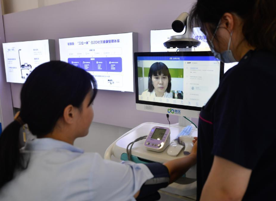某互聯(lián)網(wǎng)醫(yī)院體驗“智能醫(yī)務(wù)室”的體檢功能,并與醫(yī)生進行視頻連線 來源:新華社